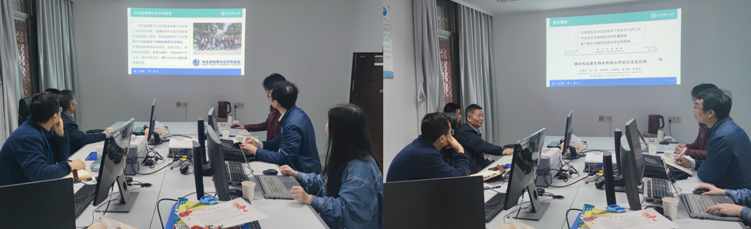 谢晶老师代表北京理工大学机电学院冲击波物理与化学实验室,就冲击波生物力学研究展开工作研讨。谢老师首先对冲击波物理与化学实验室进行了介绍。接着又围绕冲击生物力学、冲击生物防护、冲击波医学治疗、轻量化冲击防护材料等多个研究方向进行了工作报告。在报告中,谢老师展示了团队研究的多种生物冲击案例。谢老师的研究工作对生物组织冲击力学具有重要的研究价值和理论指导意义。最后,王教授、康教授和谢老师就爆炸冲击波在生物组织的动力学作用力学行为的研究方向进行了详细的研讨。谢老师表示可以从生物组织冲击动力学行为、冲击波生物传播规律及数字化模型损伤评估与预测等方面开展密切合作,双方也就此达成了合作意向。